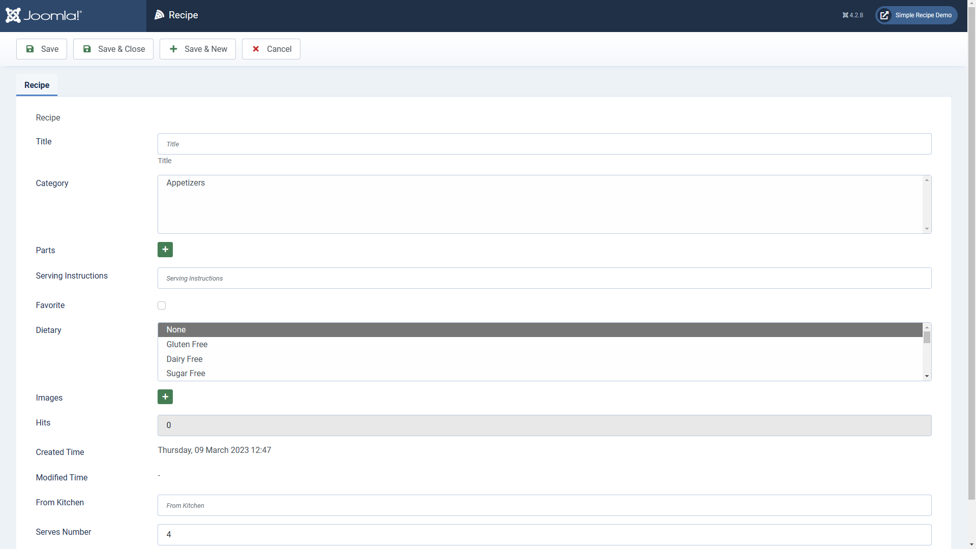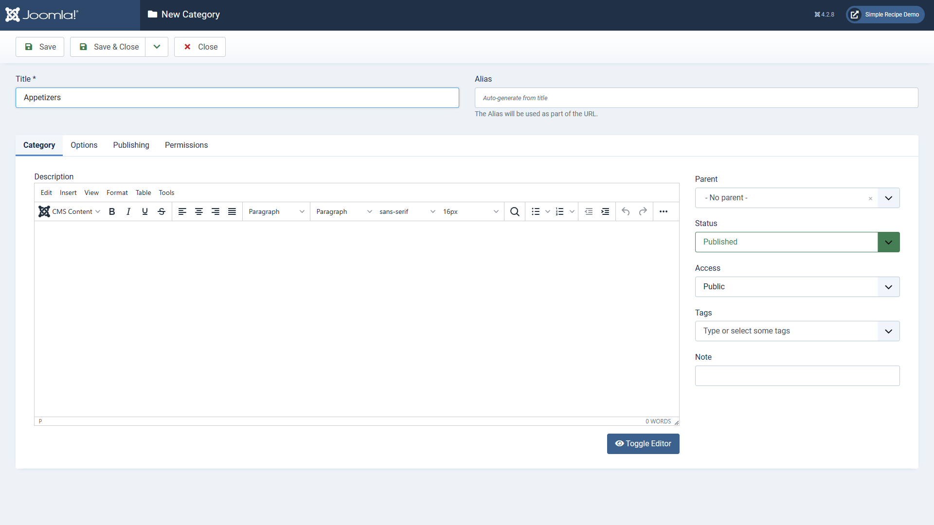 Navigate to the Components left menu item and expand to Simple Recipe, then Recipe Categories. Add a category such as Appetizers.
