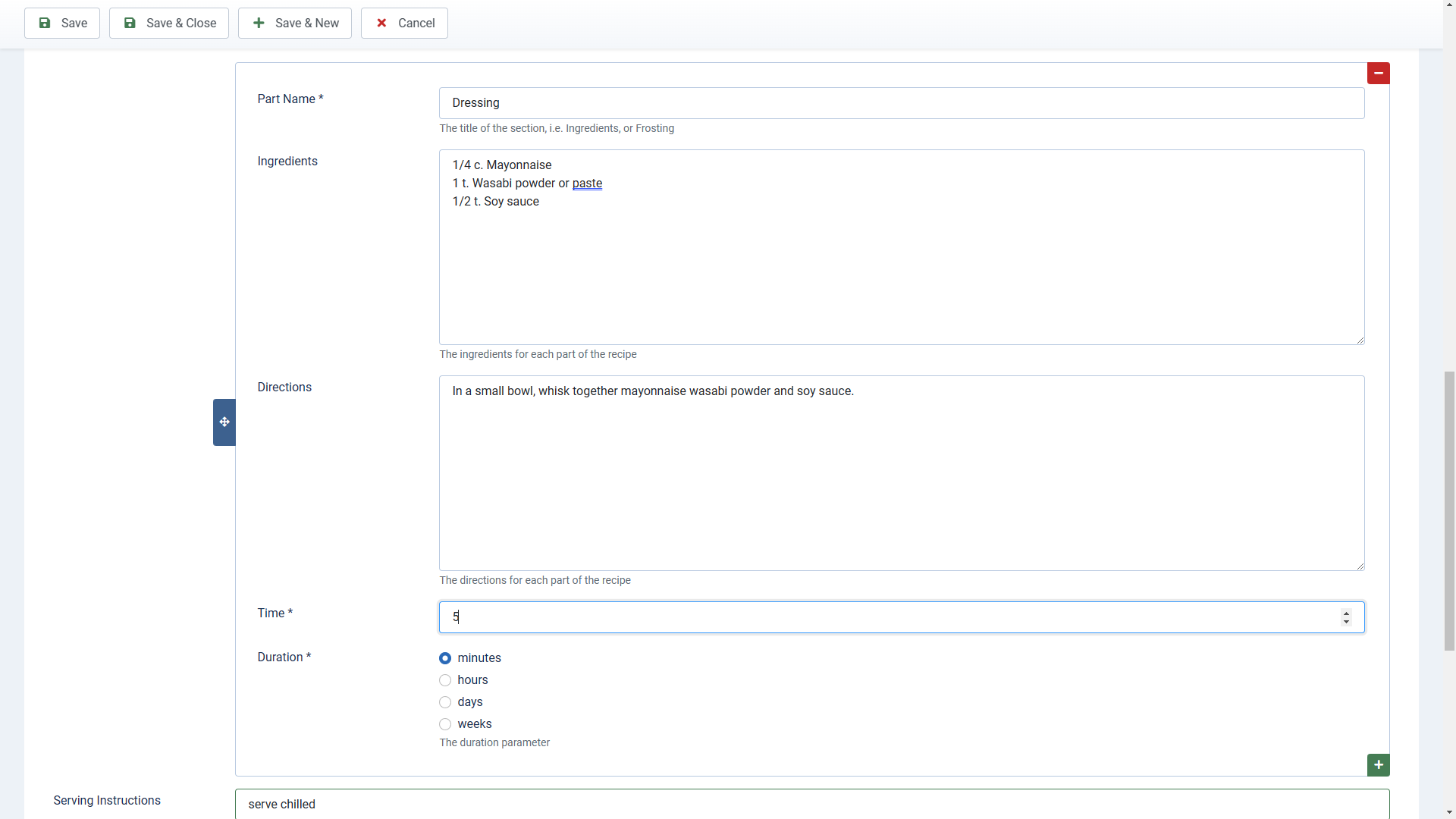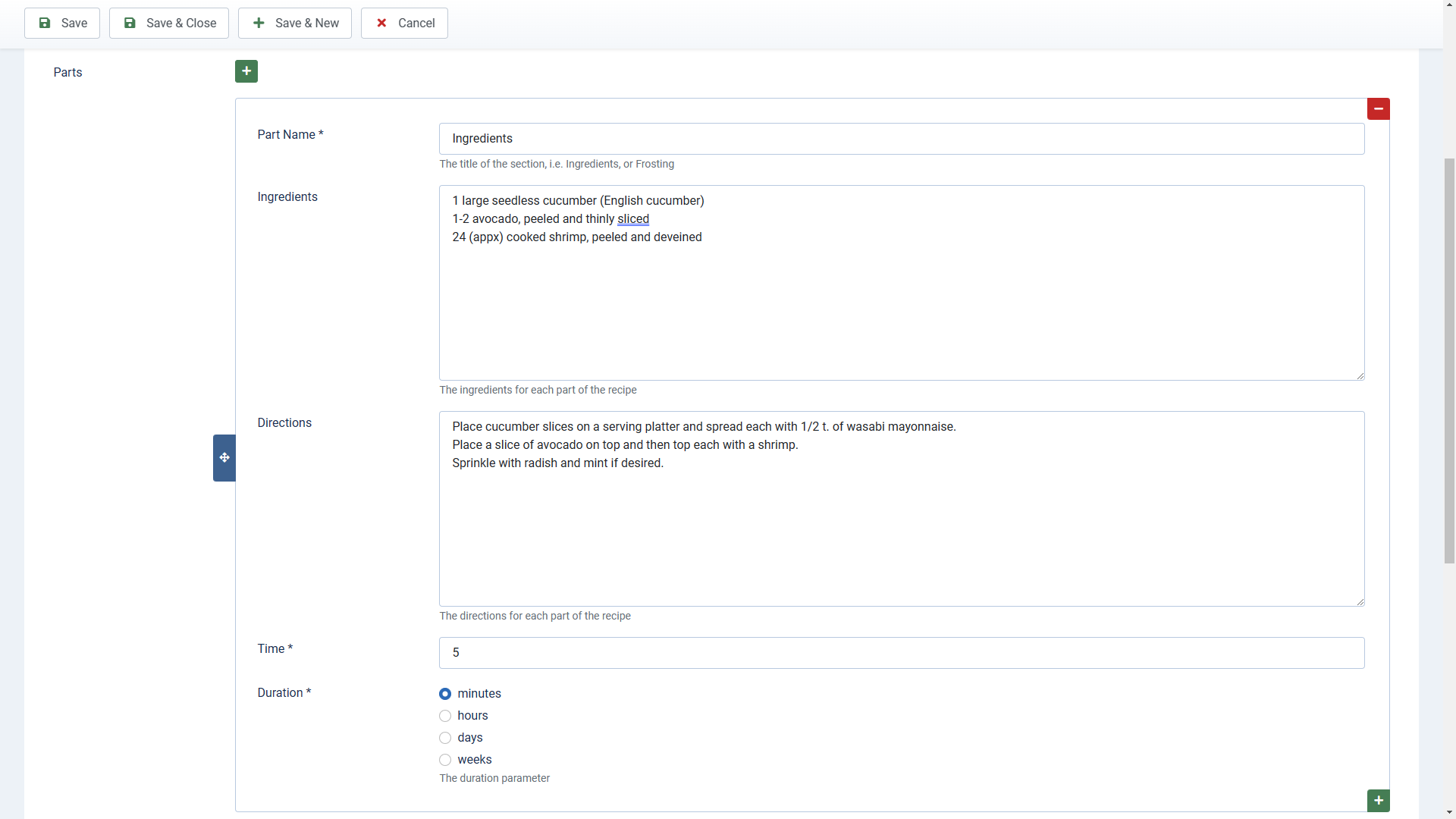 The parts button will add a subform with an Ingredients, Directions and time section. For easy recipes, this will be the extent of the information. Note that the display works best if there is just one ingredient per line. You can add simple markup like bold, italics etc.
